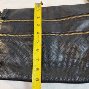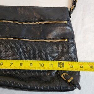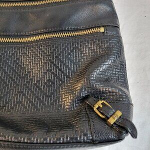 Elevate your style with this sophisticated Elliott Lucca black leather crossbody purse, designed for the modern fashionista. Crafted from premium leather, this purse features elegant gold zipper accents and a unique woven texture, adding a touch of luxury to your everyday look.