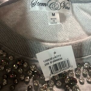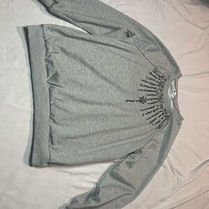 Elevate your style with this chic gray crewneck sweater, adorned with stunning embellishments. Perfect for versatile wear.