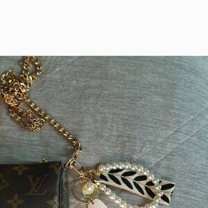 Chic keychain featuring faux pearls and quartz crystals. Accented with gold hardware for a stylish touch.