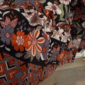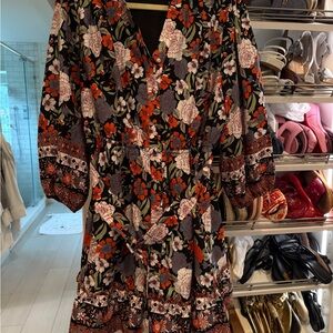 This chic 3/4 sleeve dress features a stunning floral design in black, red, orange, and white. Perfect for any occasion, it combines elegance with comfort.