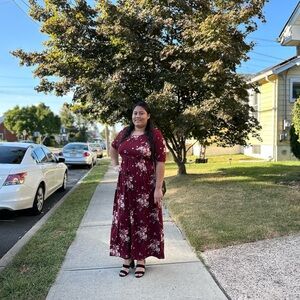 Step out in style with this chic floral maxi dress. The rich burgundy and pink hues create a stunning look perfect for any occasion.