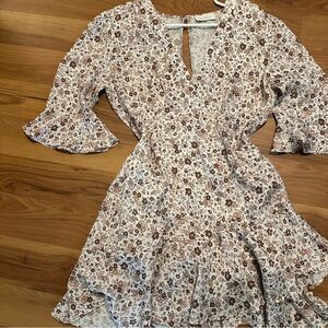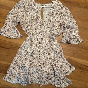 Step out in style with this chic floral midi dress. Featuring a beautiful cream and brown pattern, it's perfect for any occasion. Enjoy the flattering fit and elegant design.