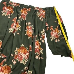 Elevate your wardrobe with this stylish off-the-shoulder dress from Joompy USA. Featuring a charming floral print on a deep green background, this top has three-quarter sleeves and measures 15.5“ P2P , Sleeve 16” and 31” in length. Crafted from a soft polyester blend, it offers both comfort and elegance. Perfect for casual outings or dressing up, this top is a versatile addition to any closet. Made in the USA.