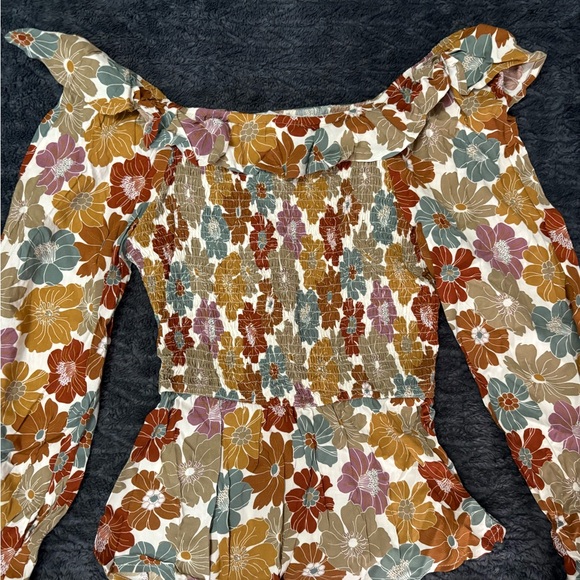Elevate your style with this chic floral ruffle blouse. Featuring a blend of orange, brown, and cream hues, it's perfect for any occasion.