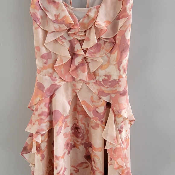 This chic mini dress features a beautiful floral pattern with elegant ruffle details. Perfect for any occasion, the soft pink tones add a feminine touch.
