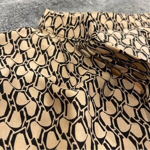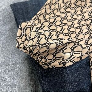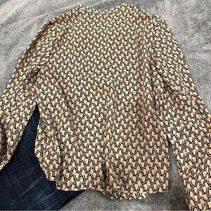 Stylish blouse with a unique geometric pattern, split neck, no buttons, nice smooth design. Perfect for any occasion. Lightweight and comfortable. Never worn. Size Large, 24” length, 22” pit to pit. Pants not included.
