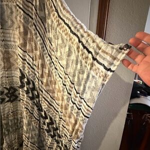 Elevate your style with this chic geometric patterned poncho. Featuring a blend of black, brown, and cream colors, it's perfect for any occasion. One size fits all.