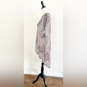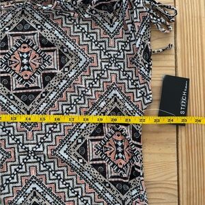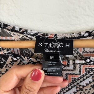 Elevate your wardrobe with this chic tunic top featuring a captivating geometric print. The blend of pink, black, and white colors offers a stylish and versatile look.
