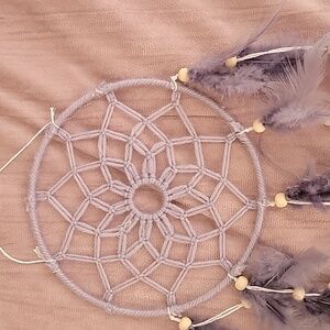 Stylish pair of gray dreamcatchers with detailed web and feather accents.