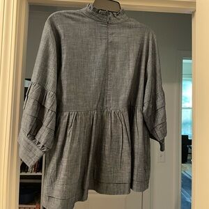 This chic chambray blouse features elegant ruffled sleeves, perfect for adding a touch of sophistication to your wardrobe. Ideal for both casual and formal occasions.