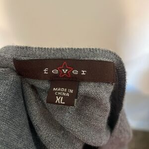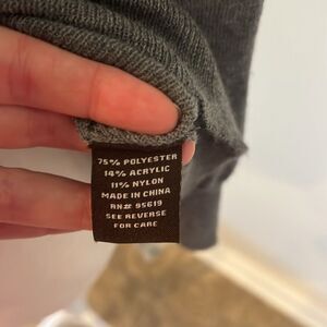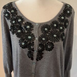 Stylish gray cardigan. Features black floral embellishments. Perfect for layering.