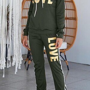 Features: This eye-catching two-piece set features a cozy, oversized cowl neck hoodie with a drawstring, paired with elastic-waist skinny jogger pants for all-day comfort. The LOVE letter print and contrast side stripes add a fun, sporty vibe. Made from a soft, stretchy blend of 95% polyester and 5% spandex—super comfy and easy to move in.