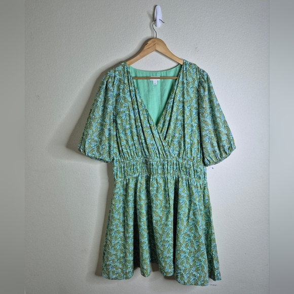 Elevate your wardrobe with this chic green patterned mini dress. Featuring a stylish V-neck and comfortable short sleeves, it's perfect for any occasion.