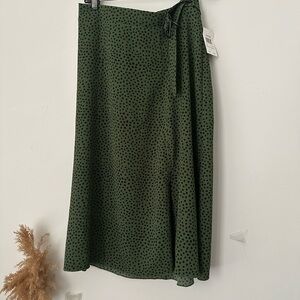 Add a chic touch to your wardrobe with this green polka dot midi skirt. Perfect for any occasion.