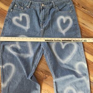 High rise jeans featuring a playful heart pattern, trendy, playful, whimsical, urban, city, hipster, streetwise, schoolgirl, collegiate, punk