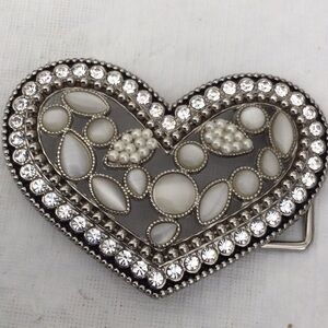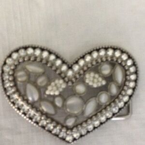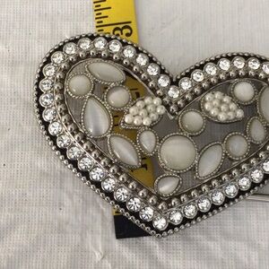 Add a touch of elegance with this chic heart-shaped belt buckle in silver and white. Perfect for enhancing any outfit with a sophisticated flair.