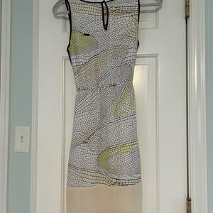 This chic high-low dress features a striking geometric pattern in cream and black. Flattering piping on the side. Perfect for making a stylish statement.
