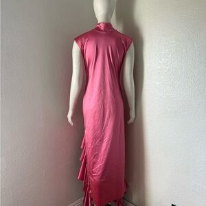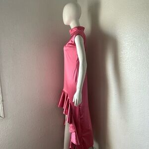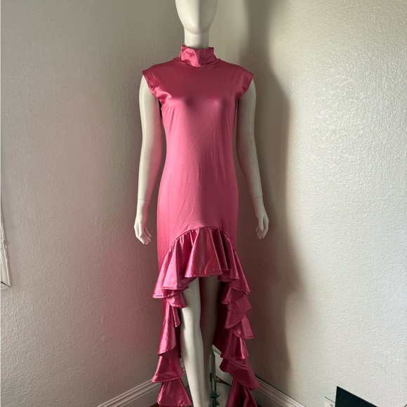 Turn heads with this chic high-low dress featuring elegant ruffles. Perfect for any occasion, this pink dress adds a touch of sophistication to your wardrobe. Only one kind of dress. Must have.