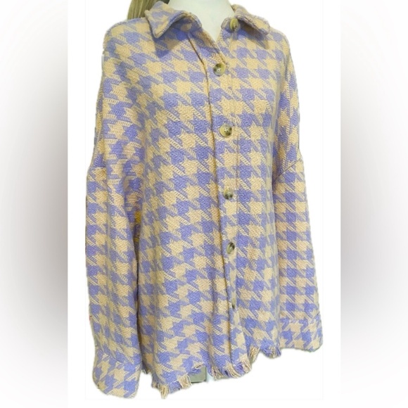 houndstooth pattern. Features button-up front. Perfect for layering.