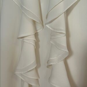 Elevate your wardrobe with this chic ivory blouse, featuring elegant ruffles for a sophisticated look. Purchased and tried on, never worn! Great topper for tank top and leggings, or over a tank dress. Elegant ruffles down the front and adorning the sleeves, including hook&eye closure down the front, or wear it open and flowy. Gorgeous ivory cream color, goes with anything in your wardrobe.