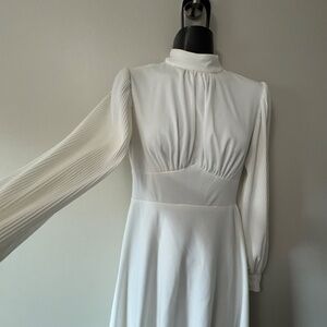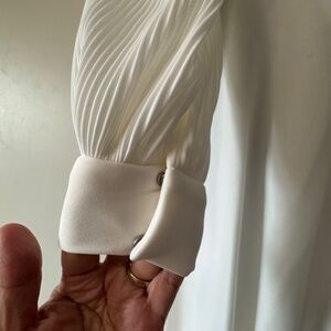 This chic ivory wedding gown features elegant long sleeves and a sophisticated design, perfect for a modern bride.