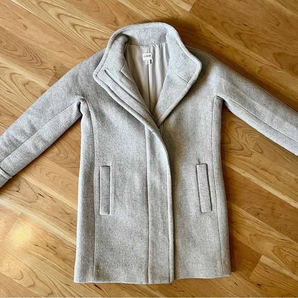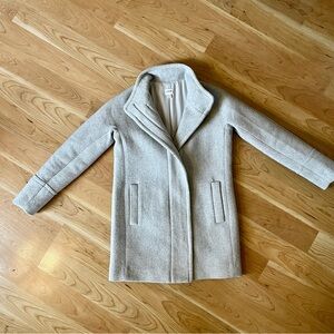 Elegant light gray coat with a soft wool blend and gold zipper closure. Ideal for versatile styling. Like new condition.