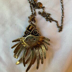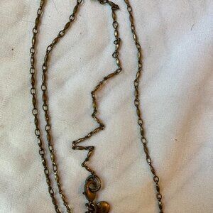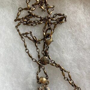 Finished in antiqued gold tone. The chain is approx. 30" long. The pendant drops at 2-1/2".