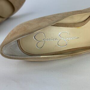 Elevate any outfit with these stunning Jessica Simpson pumps, featuring a luxurious taupe suede upper and an eye-catching faux snakeskin block heel for extra flair. The pointed toe and chunky heel make them both stylish and comfortable, perfect for work, events, or a night out. Intricate embossed texture along the heel collar adds a sophisticated touch, while the neutral color palette complements any wardrobe. Gently worn with minor sole wear, these stylish pumps are a true wardrobe essential for the modern fashionista!