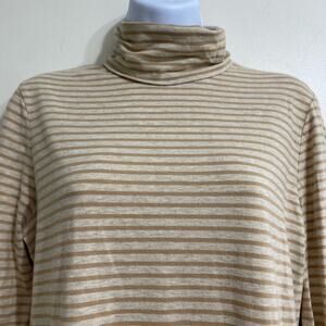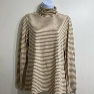 "Upgrade your wardrobe with this stylish Lands' End turtleneck for women, size Medium. Crafted with a luxurious blend of 56% cotton, 38% rayon, and 6% spandex, this turtleneck offers both comfort and durability. The elegant brown and cream hues provide versatile styling options, perfect for any season. Ideal for layering or wearing solo. Gently used and in excellent condition. Perfect for work or casual outings!"