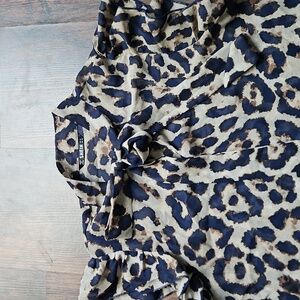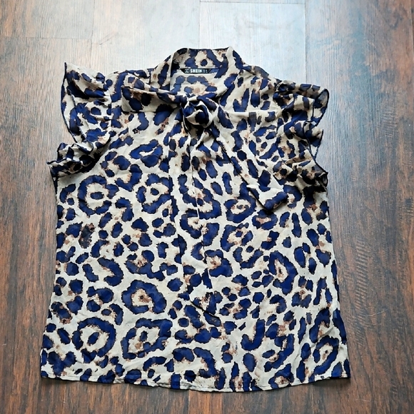 Elevate your style with this chic leopard print blouse. Perfect for any occasion, this top features a stylish bow detail and ruffled sleeves. The bold blue and tan colors make it a standout piece in your wardrobe.