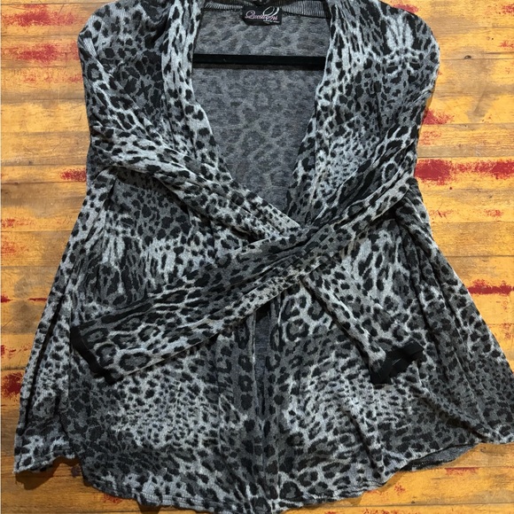 Elevate your wardrobe with this chic leopard print cardigan. Featuring a stylish gray and black design, it's perfect for any occasion.