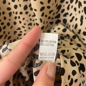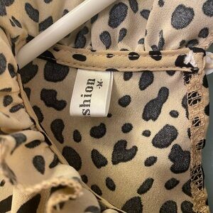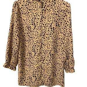 Trendy and timeless animal print blouse by Angashion. Features a flattering ruffled mock neckline, lightweight flowy fabric, and neutral tan & black colorway that pairs effortlessly with jeans, trousers, or skirts.