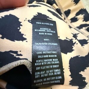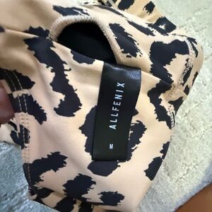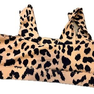 Trendy sports bra with a bold leopard print. Features striking black spots on a tan background. Ideal for workouts or casual outings. LIKE NEW