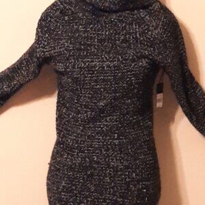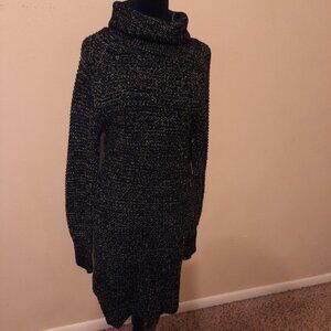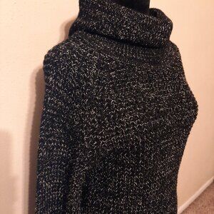Chic and cozy, this long sleeve turtleneck sweater dress features a stylish black-and-white threaded knit for a timeless look. Designed with comfort and elegance in mind, it has side slits for easy movement and a flattering silhouette. Measurements (approx.): Sleeve (from neck): 30.5"; Length (from shoulder): 40.5"; Inseam (beneath arm): 28";