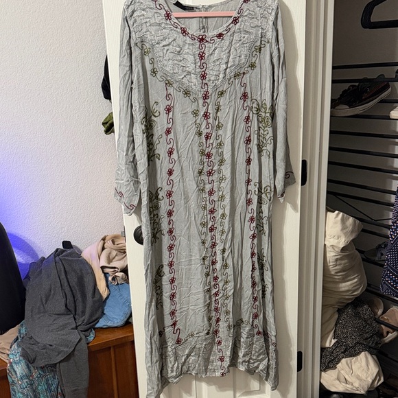 Elevate your style with this chic long sleeve dress featuring elegant embroidery in gray and green. Perfect for any occasion, this dress combines comfort with a touch of sophistication. Grey green and burgundy