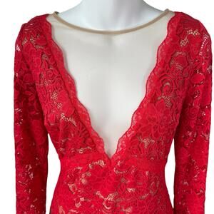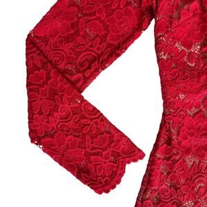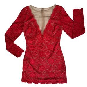 Chic Long Sleeve Lace Short Red Dress Size Medium Deep V Neckline Holiday Cocktail