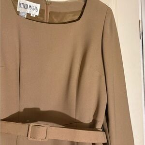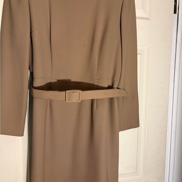 This chic tan dress features long sleeves and a stylish belt, perfect for any occasion. Its timeless design offers a sophisticated look.