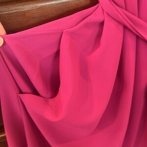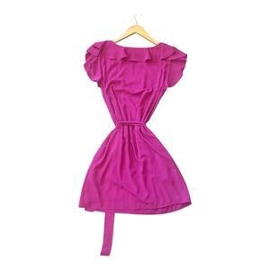 Elegant magenta dress with ruffle sleeves. Perfect for any occasion. Flattering fit with a tie waist.