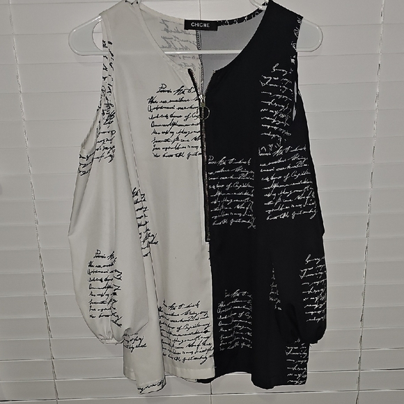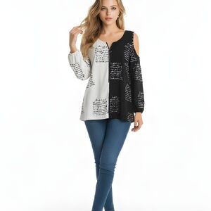 Elegant top with black and white script pattern. Features a bold, asymmetrical design.