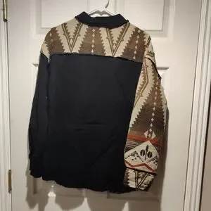 Stylish jacket with a unique multicolor pattern. Features a mix of black, cream, and brown tones with Aztec designs.NWT. No side pockets. Pet and smoke free home. Questions, just ask.