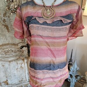 Add a vibrant touch to your wardrobe with this chic blouse featuring playful ruffles and multicolor stripes. Perfect for any occasion.