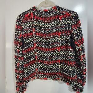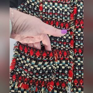Elevate your style with this chic multicolor tweed jacket. Featuring a vibrant mix of red, black, and cream, this jacket adds a touch of sophistication to any outfit. Perfect for both casual and formal occasions.