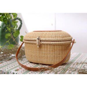 Features: Beautifully woven rattan oval basket with a cherry wood handle and top, finished with a lacquer for a polished look. Includes a push lock closure, convenient credit card slot, and waterproof design. Roomy enough to carry your essentials — perfect for spring, summer, fall, or winter outings. Great as a stylish accessory or a unique gift.