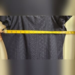 dark blue or navy top with short, ruffled sleeves and a square neckline. The fabric features an eyelet or perforated pattern throughout.