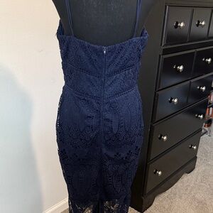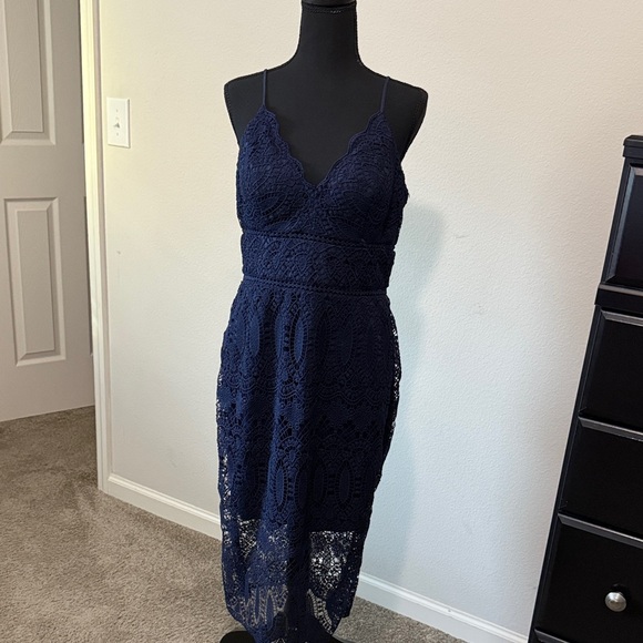 Chic Navy Lace Midi Dress Great for the holidays or a formal event