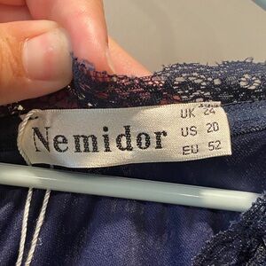 This chic navy midi dress features a beautiful lace overlay, perfect for elevating your style. Ideal for any special occasion.