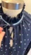 Elegant navy blouse with white polka dots. Features a stylish ruffled neckline and cuffs. Perfect for any occasion. Soft! It’s a knit that looks like a blouse