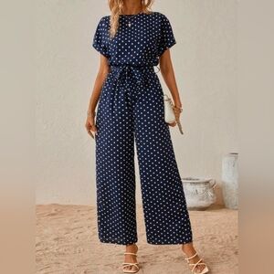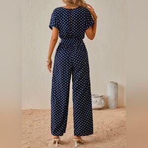 Elevate your wardrobe with this chic navy polka dot jumpsuit. Designed for comfort and style, it's perfect for any occasion.