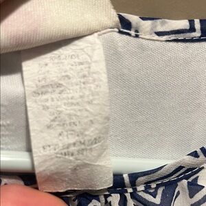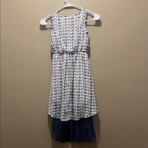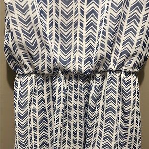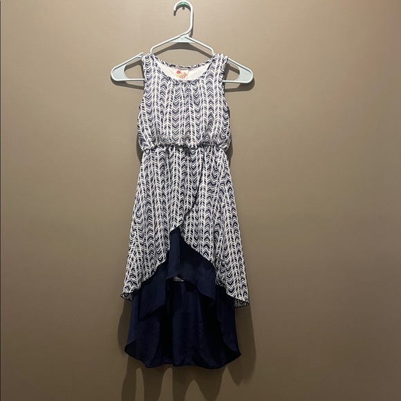 Elegant sleeveless dress with a navy and white pattern. Features a stylish high-low hem.