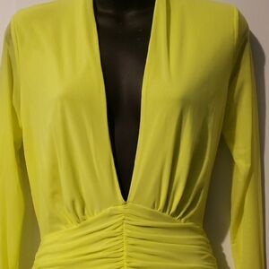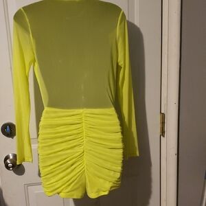Eye-catching neon yellow/ greenish shorts. One piece romper with a stylish ruched design. Ideal for a night out. Beach coverup